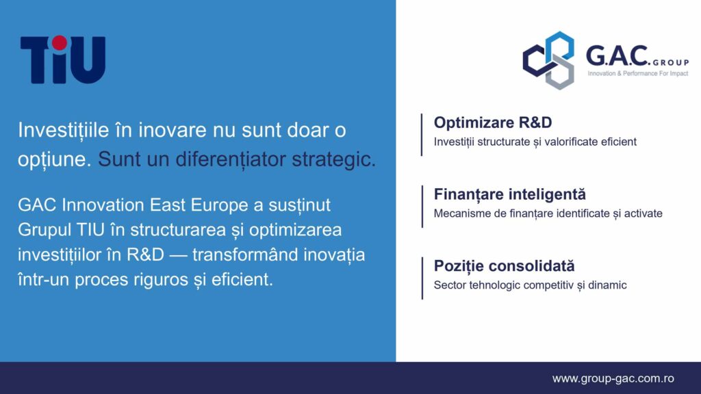 Grupul TIU, unul dintre principalii integratori de soluții tehnologice și infrastructură critică din România, a dezvoltat un parteneriat cu GAC Innovation East Europe pentru structurarea și optimizarea investițiilor în R&D. Colaborarea vizează valorificarea mecanismelor de finanțare disponibile și transformarea activităților de cercetare-dezvoltare într-un proces riguros, sistematic și orientat spre rezultate.